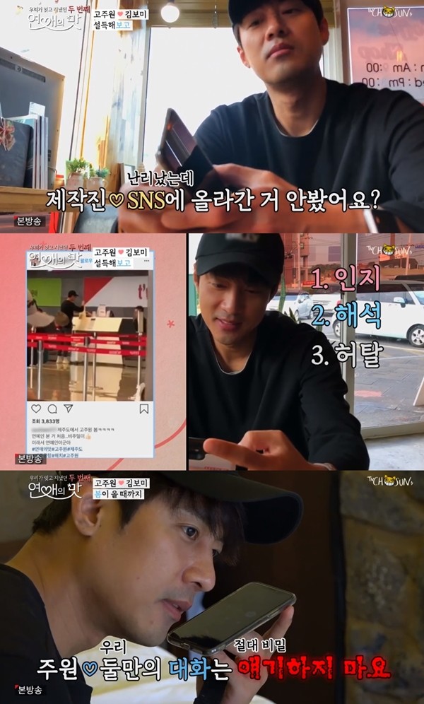 고주원은 "못봤다"고 태연히 말했다. 데이트하느라 정신이 없었던 것. 고주원은 제작진의 도움으로 SNS에 퍼진 데이트 영상을 보고 헛웃음을 지었다. 고주원은 "걸렸네"라면서도 "앞으로 찾기 쉽지 않을거다"고 말해 웃음을 자아냈다.