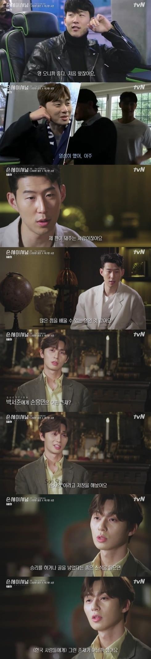 이어 손흥민은 "어릴 때 유럽으로 와서 친구가 거의 없다. 그런데 박서준 형하고 확 가까워지지 않았나. 영국에서 만난 뒤로 되게 가까워졌다. 나에게는 형이라는 존재가 많은 큰 힘이 된다"라고 말해 박서준을 쑥스럽게 했다.