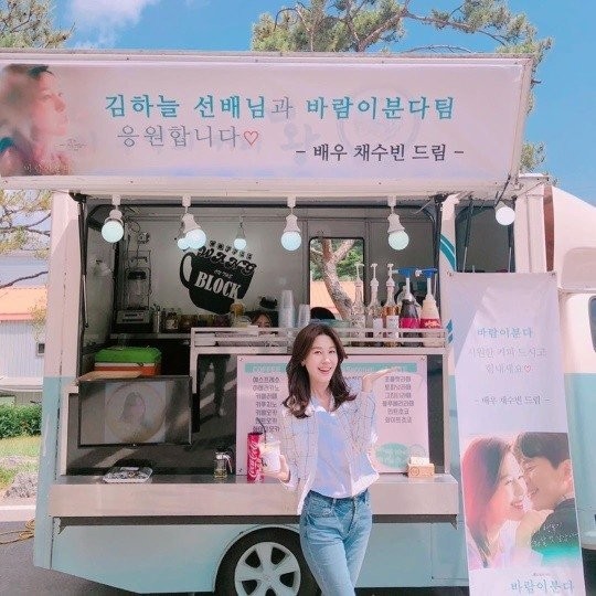 공개된 사진 속에는 채수빈이 JTBC '바람이 분다' 촬영장에 보내온 커피차 앞에서 환한 미소를 지으며 인증샷을 남기고 있는 김하늘의 모습이 담겨있다.
