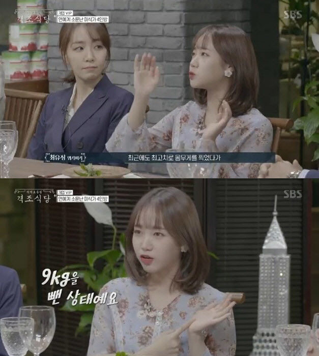 최유정은 "안 그래도 최근에 최고치 몸무게를 찍었다가 9kg을 뺀 상태"라며 "한 달만에 뺐다"고 밝혀 놀라움을 자아냈다.