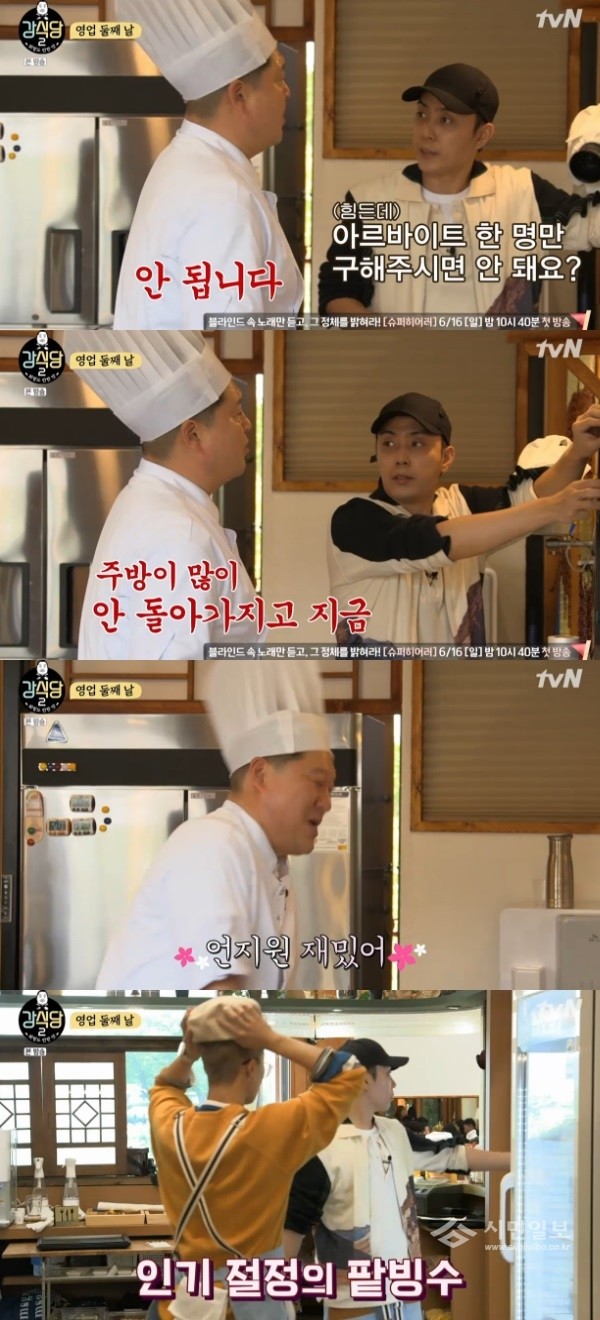 결국 은지원은 강호동에게 “아르바이트 한 명만 구해주시면 안돼요?”라고 부탁했다. 강호동은 “안돼요. 주방이 안돌아가서”라고 단칼에 거절했다. 은지원은 “그럼 안녕히 계세요”라고 고개를 숙였다.