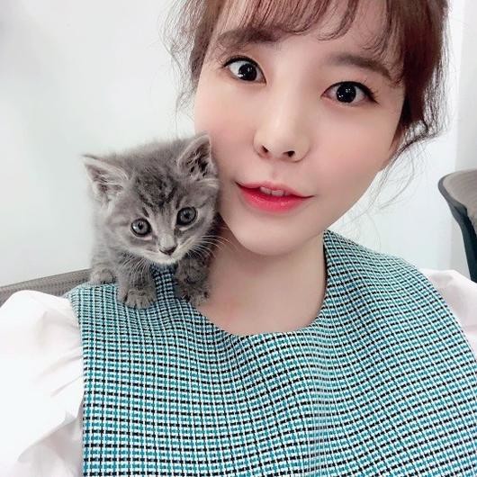 공개된 사진 속 써니는 어깨 위에 올라간 반려묘 후추와 함께 해맑게 웃고 있는 모습. 써니의 작은 얼굴보다 더 작은 아기 고양이가 보는 이의 마음을 녹인다. 써니는 고양이상의 매력적인 얼굴로 시선을 사로잡는다.