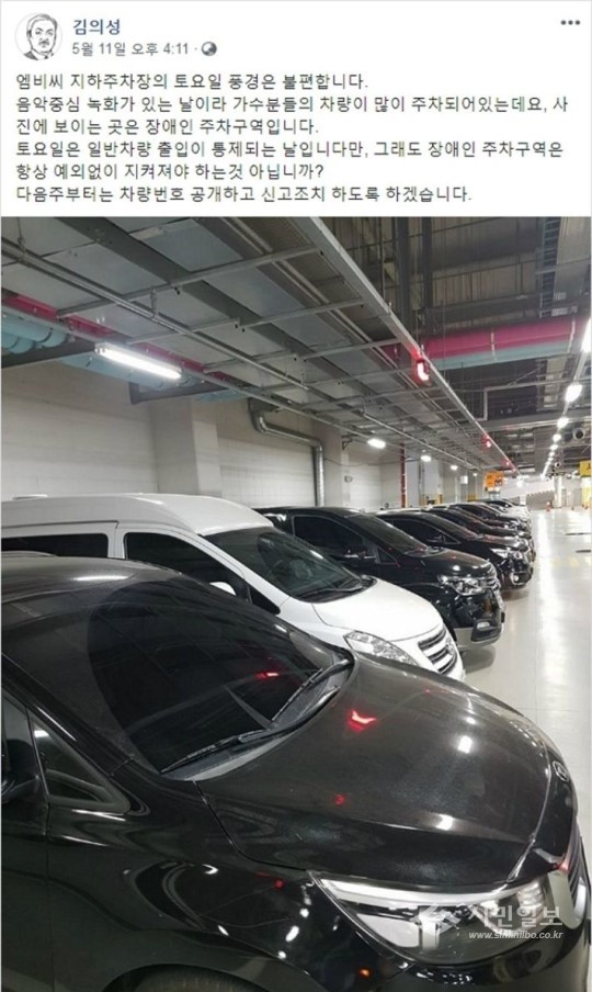 김의성은 "엠비씨(MBC) 지하주차장의 토요일 풍경은 불편합니다. 음악중심 녹화가 있는 날이라 가수분들의 차량이 많이 주차되어있는데요, 사진에 보이는 곳은 장애인 주차구역"이라며 "토요일은 일반차량 출입이 통제되는 날입니다만, 그래도 장애인 주차구역은 항상 예외 없이 지켜져야 하는 것 아닙니까"라고 지적하며 누리꾼들의 응원이 이어졌다.