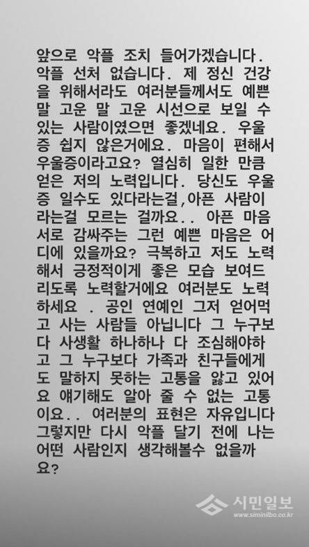 이어 "우울증 쉽지 않은 거예요. 마음이 편해서 우울증이라고요? 열심히 일한 만큼 얻은 저의 노력입니다. 당신도 우울증일 수도 있다라는 걸, 아픈 사람이라는 걸 모르는 걸까요.. 아픈 마음 서로 감싸주는 그런 예쁜 마음은 어디에 있을까요? 극복하고 저도 노력해서 긍정적이게 좋은 모습 보여드리도록 노력할 거예요. 여러분도 노력하세요. 공인 연예인 그저 얻어먹고 사는 사람들 아닙니다. 그 누구보다 사생활 하나하나 다 조심해야 하고, 그 누구보다 가족과 친구들에게도 말하지 못하는 고통을 앓고 있어요. 얘기해도 알아줄 수 없는 고통이요.."라고 호소했다.
