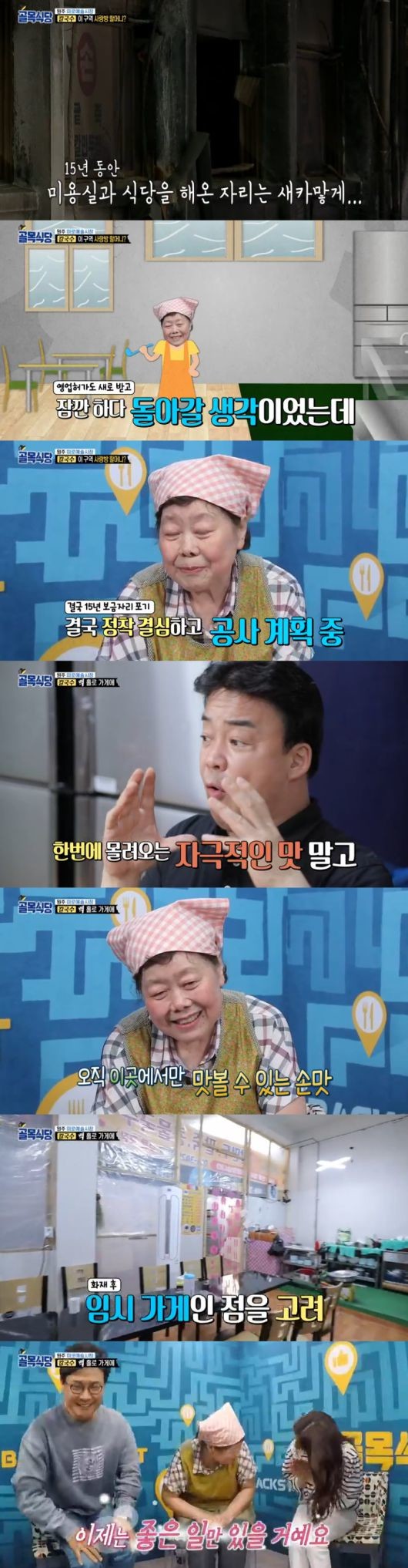 백종원은 두 번째 가게로 칼국수 집을 찾았다. 75세 할머니 혼자 운영하는 이곳에 대해 김성주는 "화재 났을 때 피해를 보아서 이곳으로 임시 이사 온 것"이라고 설명했다. 임시 식당은 아무것도 없는 창고에 비닐로 벽을 가려 창문도 없었다.