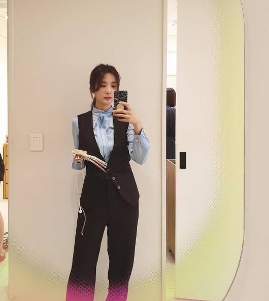 하늘색 블라우스에 검정색 베스트를 매치해 고풍스러운 분위기를 풍긴다. 이청아는 카메라와 비교해도 작은 얼굴을 자랑한다.