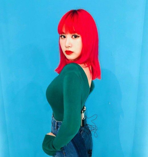 사진 속 박지민은 강렬한 레드 컬러로 물들인 헤어스타일을 한 채 카메라를 응시하고 있다.