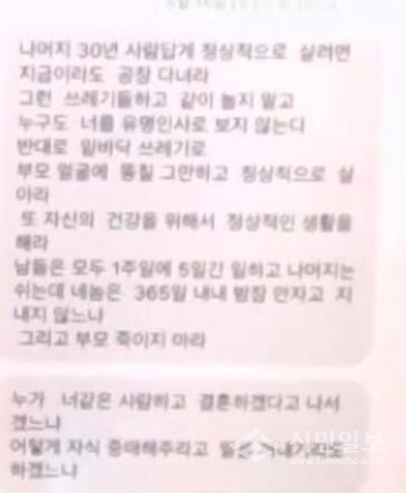 이어 "남들은 모두 1주일에 5일간 일하고 나머지는 쉬는데 네놈은 365일 내내 밤잠 안자고 지내지 않느냐. 그리고 부모 죽이지 마라"며 "누가 너같은 사람하고 결혼하겠다고 나서겠느냐. 어떻게 자식 중매해주라고 말을 꺼내기라도 하겠느냐"고 덧붙였다.