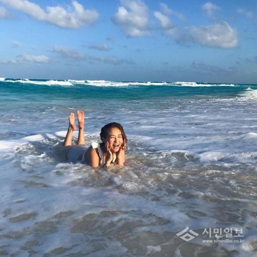 공개된 사진 속 진재영은 바다에 엎드린 채 카메라를 바라보고 있다.