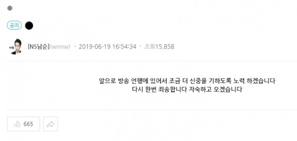 지난 6월 19일 NS남순은 자신의 아프리카TV 공지사항을 통해 "앞으로 방송 언행에 있어서 조금 더 신중을 기하도록 노력하겠습니다"라며 "다시 한번 죄송합니다. 자숙하고 오겠습니다"는 사과의 말을 올렸다.