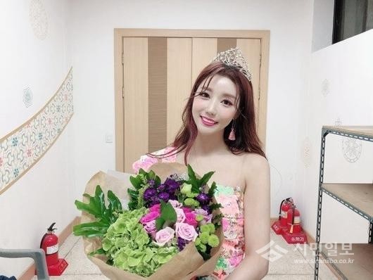 공개된 사진 속 두리는 커다란 꽃다발을 들고 카메라를 응시하고 있다. 커다란 왕관을 쓰고 공주같은 자태를 뽐내는 두리가 시선을 끈다.