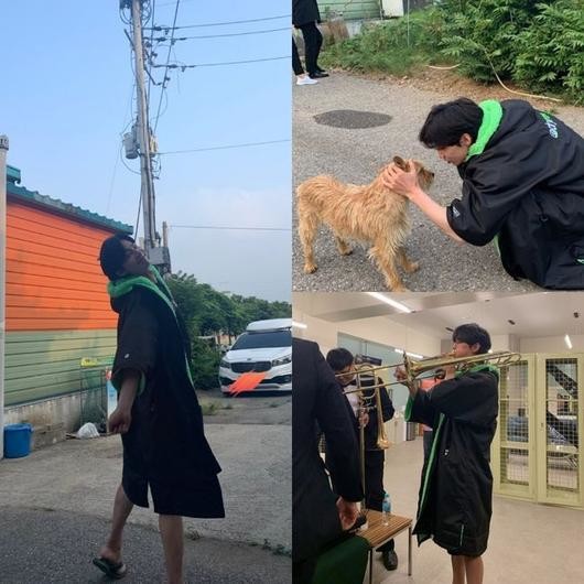 사진 속 송재림은 비치판초를 입고 밝게 웃으며 기지개를 켜거나 강아지에게 물을 주며 교감하는 등 촬영장 주변을 맴돌고있다.