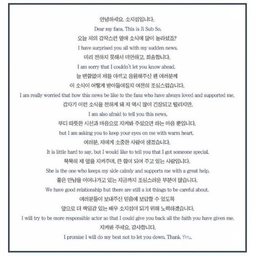 이어 소지섭은 "여러분, 저에게 소중한 사람이 생겼다. 묵묵히 제 옆을 지켜주며 큰 힘이 되어 주고 있는 사람이다다. 좋은 만남을 이어나가고 있는 지금까지 조심스러운 부분이 많다"라면서 "여러분들이 보내주신 믿음에 보답할 수 있도록 앞으로 더 책임감 있는 배우 소지섭이 되기 위해 노력하겠다"라고 지지를 당부했다.