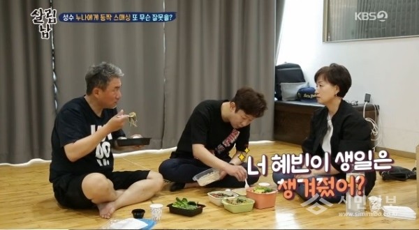 이어 누나는 “오늘 혜빈이 생일이잖아”라고 말을 꺼냈다. 당황한 김성수는 “오늘 며칠이야?”라고 되물었다. 천명훈은 “딸 생일을 몰라요?”라고 나무랐고 김성수는 “내일인 줄 알았어”라고 머리를 긁적였다. 누나는 “명훈 씨 조금만 실례해요”라며 김성수의 등을 때렸다.