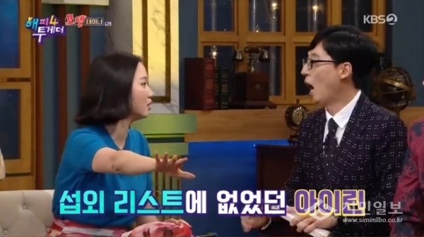 하지만 이런 열정을 보이는 아이린이 원래 '해피투게더 시즌 4' 출연 목록에 없었다고 밝혀져 놀라움을 자아냈다. 이에 유재석은 "장윤주가 오늘 제일 잘한 일은 아이린을 섭외한 것"이라고 말해 웃음을 선사했다.