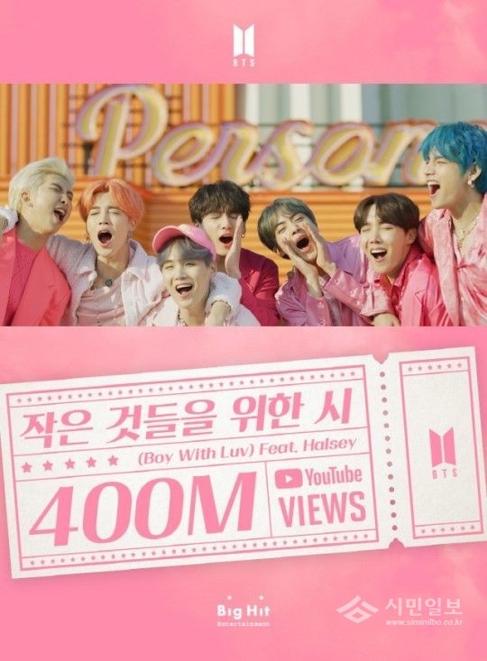 그룹 방탄소년단의 '작은 것들을 위한 시 (Boy With Luv)' 뮤직비디오가 4억뷰를 돌파해 세계팬들의 이목을 집중시켰다.