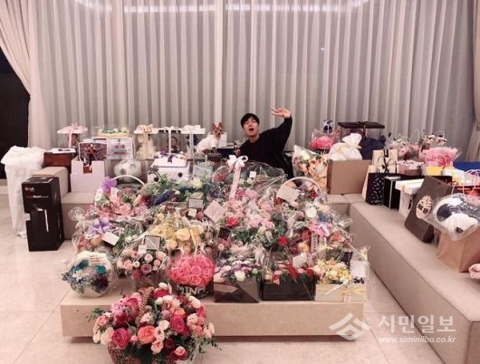 공개된 사진 속에는 수많은 선물 더미에 파묻힌 이민호의 모습이 담겨 있다. 그의 행복한 미소와 잘생긴 미모가 보는 이들의 시선을 사로잡는다.