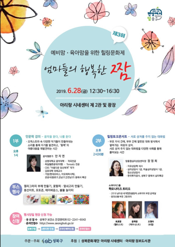 [시민일보=고수현 기자] 서울 성북구(구청장 이승로)가 오는 28일 낮 12시30분 아리랑시네센터에서 예비맘 및 육아맘을 위한 축제 '제3회 엄마들의 행복한 짬'을 개최한다.