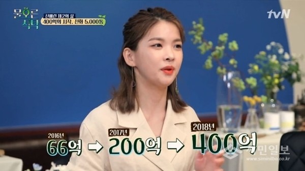 이어 "그 다음부터 1000만원 단위가 된 거다. 더 만들어야겠다는 생각을 해서 생산량도 늘리고 매출도 잘 따라줬다. 그 해 판매를 4개월 했는데4개월 동안 8억 9천, 그 다음 해에는 66억의 매출이 났다. 그 다음 해에는 200억, 이전년도에는 400억"이라고 매년 수익이 늘고 있음을 밝혔다.
