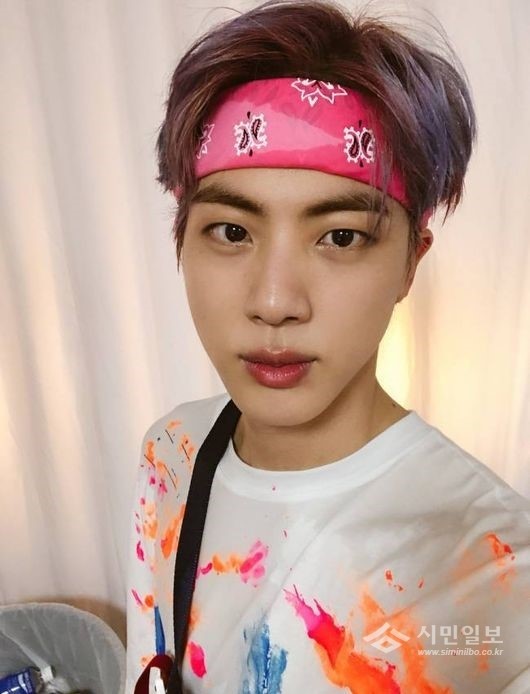 공개된 사진에는 글로벌 팬미팅을 마치고 대기실에서 촬영한 것으로 보이는 진의 모습이 담겨 있다. 특히, 핑크색 두건을 두른 진의 모습이 파이팅 넘친다.