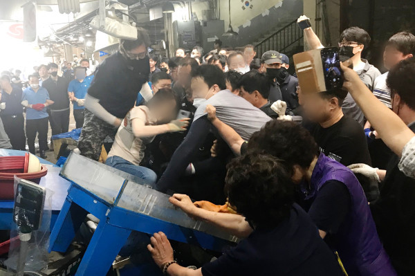 | ▲ 27일 서울 동작구 구 노량진수산시장에서 수산물 판매장 내 점포를 대상으로 7차 명도집행에 나선 법원 집행인력과 수협 측 직원들이 상인들과 충돌을 빚고 있다. (사진제공=연합뉴스) | ||