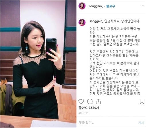 이에 송가인은 지난 6월 23일 자신의 인스타그램에 “며칠 전 교통사고 소식으로 팬 분들과 주변 분들에게 심려를 끼친 것 같아 죄송스런 맘으로 며칠을 보냈다”라고 말문을 열었다.