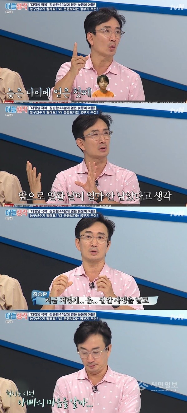 최근 방송된 tvN 예능프로그램 '애들 생각'에 김승환이 44세 때 얻은 늦둥이 아들과 딸 그리고 17세 연하인 아내와의 일상을 공개해 눈길을 모았다.