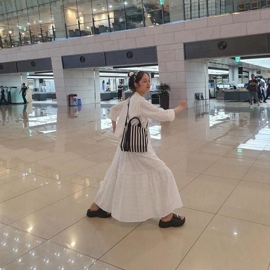 공개된 사진 속 김보라는 하얀색 긴원피스를 입고 공항에서 포즈를 취하고 있다.