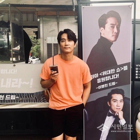 사진 속에는 이병헌이 tvN '위대한 쇼' 촬영장에 보내온 커피차 앞에서 훈훈한 미소를 짓고 있는 송승헌의 모습이 담겨 누리꾼들의 시선을 사로잡았다.
