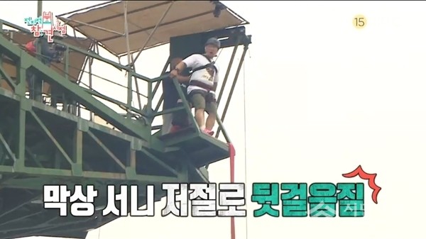 이를 지켜보던 송팀장은 쪽방으로 숨었지만 전현무에게 곧바로 잡혀 왔다. 결국 번지점프대 앞에 선 송팀장. 머뭇거리던 그에게 양세형은 "우리 삶은 곧 도전"이라고 격려했다.