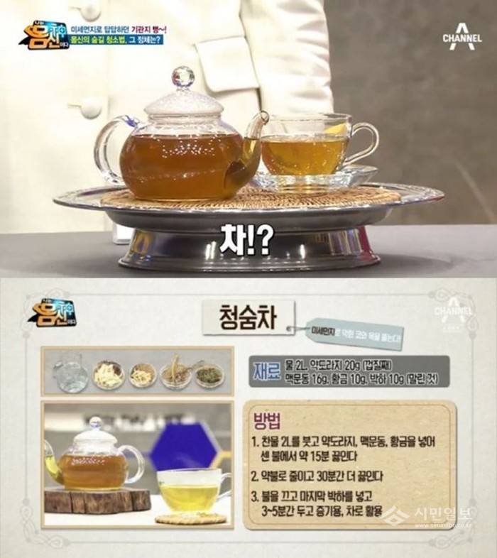 이날 방송에서 김소형 박사는 "따뜻한 청숨차의 증기를 5분 정도 흡입하면 막힌 코가 뚫기고 목, 폐까지 숨길을 뚫어주고 기관지에 붙은 미세먼지까지 청소해준다"고 말했다.