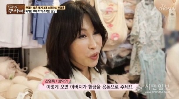 신영옥이 국내에서 활동하며 얻은 수입은 모두 아버지가 관리한다고. 신영옥은 "(국내 활동 수입) 대부분은 다 아버지께 드리지 않냐"는 질문에 "다 아버지께 드린다. 전 보지도 못 하게 한다. 난 못 본다"고 답했다.
