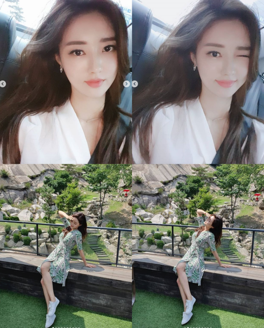 황미나는 2일 자신의 인스타그램에 “너무 아름답다 자연! 초록초록해~”라는 메시지와 함께 푸른 나무와 돌 잔디를 배경으로 햇살을 만끽하는 사진을 공개했다. 초록 문양의 원피스를 입어 싱그러움을 더했다.
