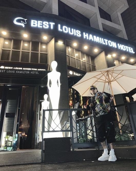 사진 속 도끼는 부산 소재 자신의 호텔 앞에서 포즈를 취하고 있다. 도끼는 특유의 스웨그를 뽐내 눈길을 끌었다.