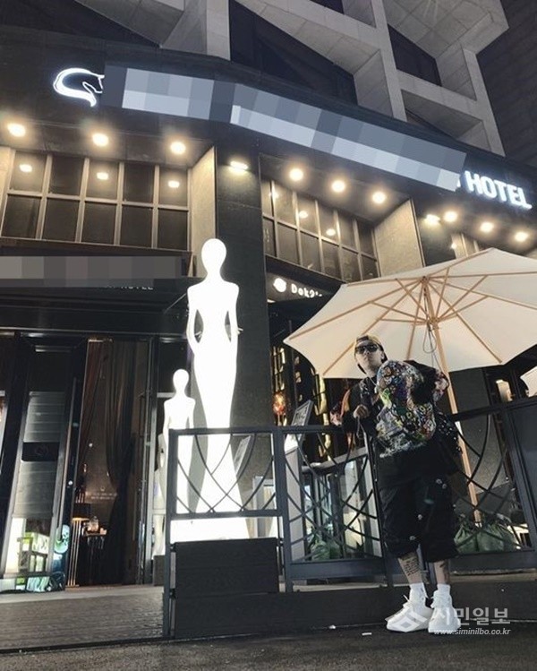 사진 속 도끼는 부산의 한 호텔 앞에 서 포즈를 취하고 있다. 해당 호텔은 지난 2월부터 도끼가 매입해 운영 중인 부티크 호텔로 알려졌다.