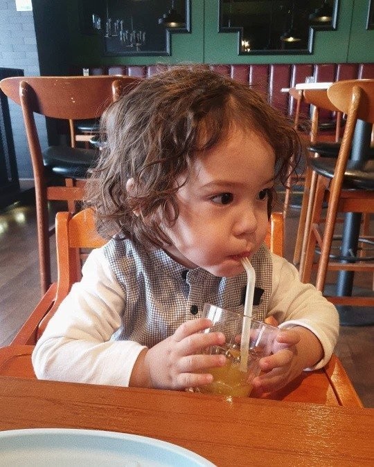 사진 속 건후는 주스를 마시며 초롱초롱한 눈빛을 하고 있다. 건후의 오밀조밀한 이목구비가 귀여움을 자아낸다.