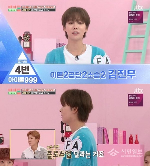 이날 김진우는 자기 PR 시간에 나서 "저는 위너에서 얼굴을 맡고 있다"고 말했다. 이어 앞 모습과 옆 모습, 뒤통수까지 자랑하며 "말이 필요 없다"고 어필했다.
