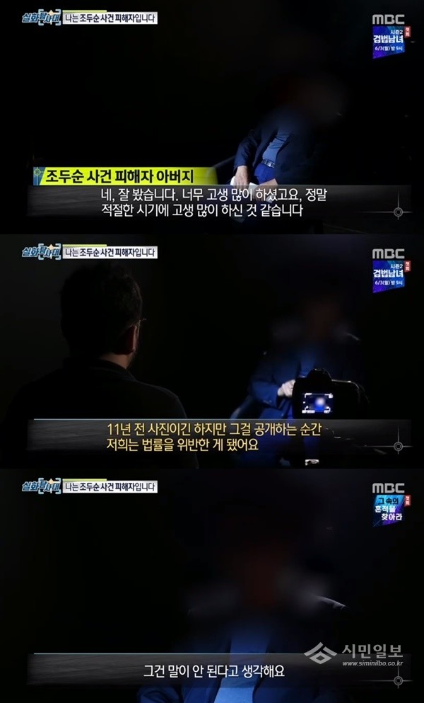 이날 조두순 사건 피해아동 아버지가 인터뷰를 진행했다. 앞서 '실화탐사대'는 조두순의 얼굴을 세상에 공개한 바 있다. 이와 관련 아버지는 "적절한 시기에 고생해주셔서 감사하다"고 인사했다.