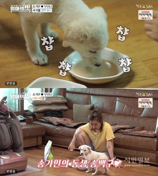 최근 방송에서는 송가인이 팬으로부터 백구를 선물 받아 집으로 데려가는 모습이 그려졌다.
