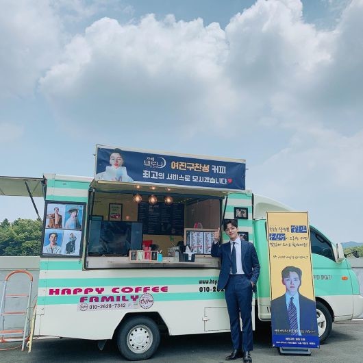 여진구는 커피차 안에 비치된 텔레비전 속 자신의 모습과 커피차에 기댄 채 포즈를 취한 모습 등을 여러장 찍어올렸다. 사진 속 여진구는 네이비색 줄무늬 정장을 입고 머리를 넘긴 성숙한 모습이었다.