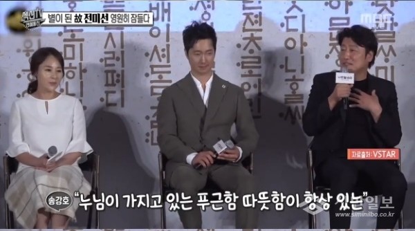 영화 ‘나랏말싸미’로 호흡을 맞춘 송강호는 “제가 선배지만 누님이 가지고 있는 푸근함과 편안함이 항상 느껴져요. 괜히 제가 후배 같아요”라고 털어놨다. 당시 전미선은 “화합이 잘 맞으니까 잘 넘어가는 거예요”라며 “끝나고 나니까 안타깝기도 해요”라고 화답했다.