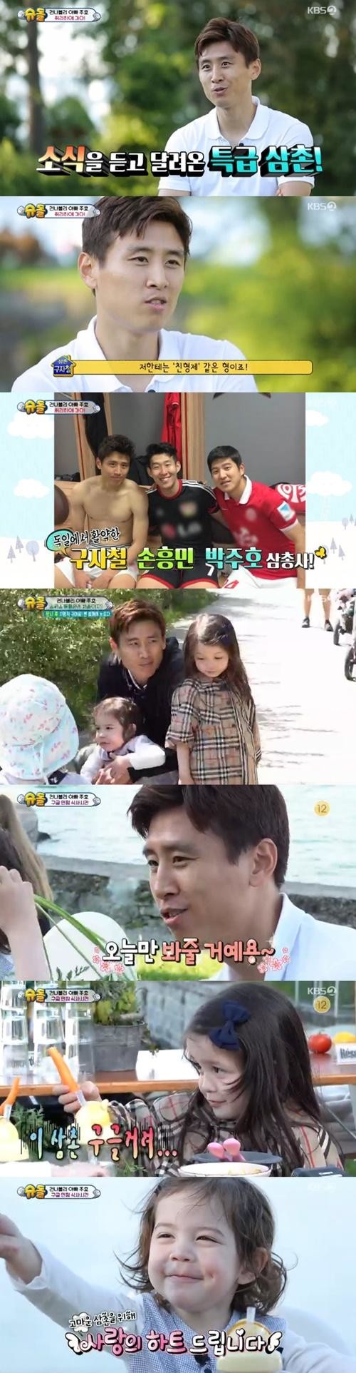 이날 광희에 이어 구자철이 나은-건후 남매를 책임질 새 삼촌으로 등장했다. 구자철은 "저도 두 아이의 아빠"라며 "'마인츠'에서 1년 넘게 동고동락했던 친형제 같은 형이 박주호다. 가족끼리 왕래가 잦았고 키즈카페에 함께 가기도 했다"고 남다른 친분을 밝혔다.
