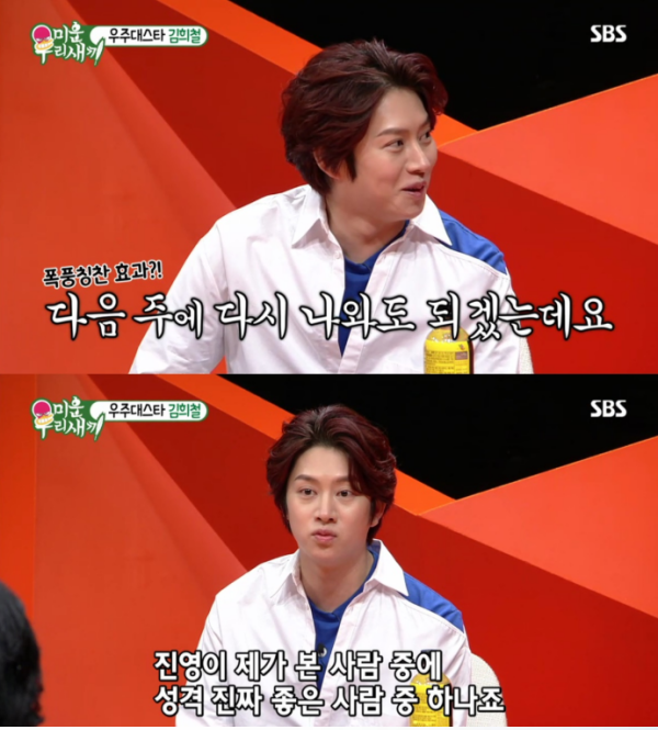 이에 신동엽이 “이제 결혼할 나이가 다 되었는데, 어머니의 반응은 어떠냐?”라고 묻자 희철은 “마흔 전에는 가야되지 않겠냐”고 밝히며 홍진영에 대해 “제가 본 사람 중에 성격 진짜 좋은 사람이다”고 말했다.