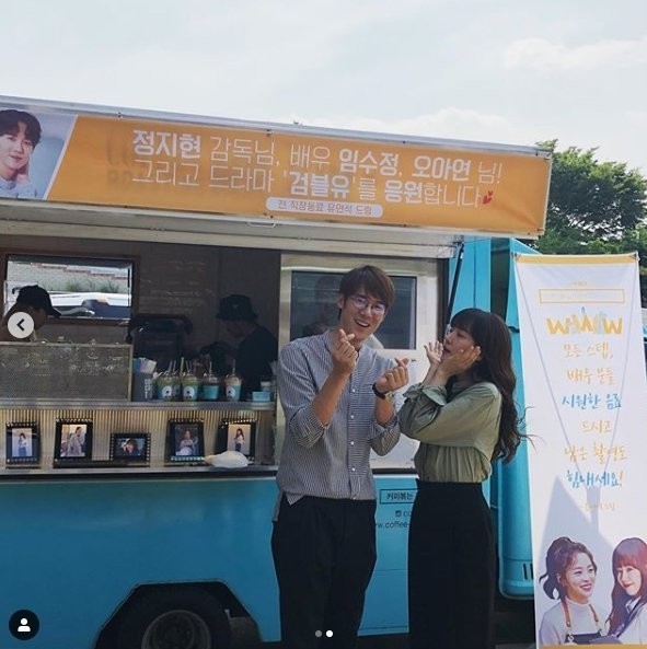 임수정은 4일 자신의 SNS에 "고마워요~ 구 직장 동료님"이라는 글과 함께 두 장의 사진을 게재했다. 공개된 사진 속 임수정은 유연석이 선물한 커피차 앞에서 포즈를 취하고 있다.