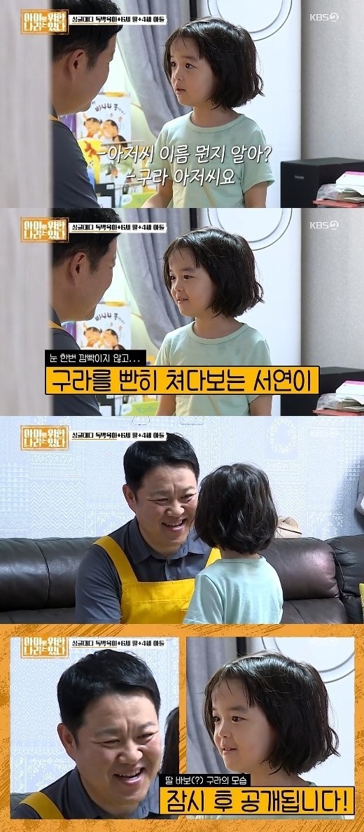 “아저씨 이름 뭔지 알아”라는 질문에 “구라 아저씨요”라고 똑부러지게 답한 서연. 김구라가 “아저씨 알아?”라고 하자 서연이 고개를 끄덕이며 김구라에게서 시선을 떼지 못했다.