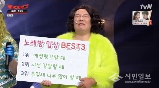 마지막으로 이국주는 보기 싫은 노래방 추임새 1위로 애정행각 할 때를 뽑았다. 이국주는 "어떤 애들 보면 나 노래 부르는데 본인들끼리 뒤에서 난리"라고 말했고 관중들은 이국주의 말에 격하게 공감했다.