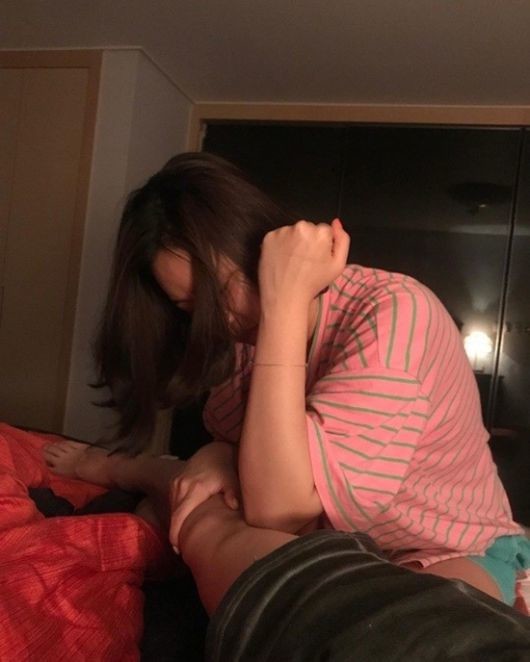 공개된 사진 속 김연지는 팔꿈치로 유상무의 다리를 누르며 마사지를 하고 있다. 남편을 위해 열심히 마사지 하는 김연지의 모습이 훈훈함을 자아낸다.