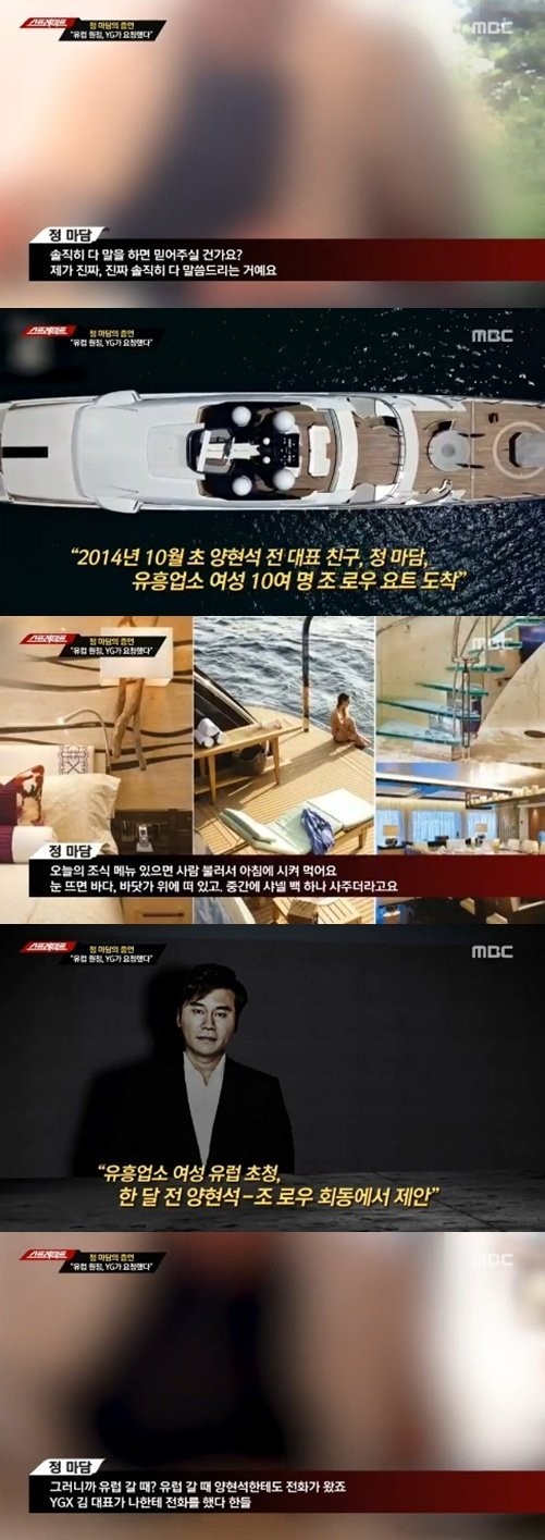 8일 방송된 MBC '스트레이트'에서는 YG 양현석의 성접대 의혹에 대한 '정마담'의 증언이 공개됐다.
