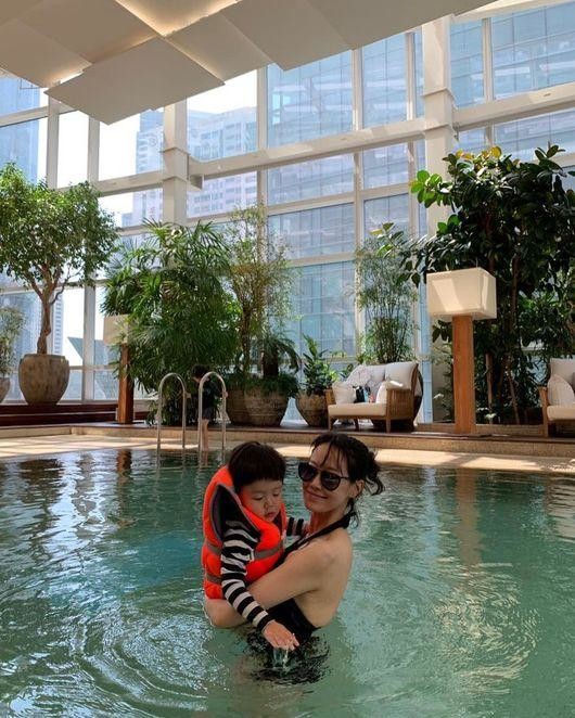 공개된 사진 속 문지애는 수영장 안에서 범민 군을 끌어안고 있다. 물을 싫어하는 기색을 드러내지 않는 문지애의 모습이 눈길을 끈다. 구명조끼를 입고 물장구를 치고 있는 범민 군은 사랑스럽다.