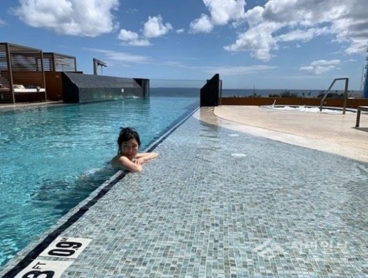 사유리는 8일 자신의 인스타그램을 통해 "하늘 예뻐서 수영 재미있었다"는 글과 함께 여러 장의 사진을 게재했다.